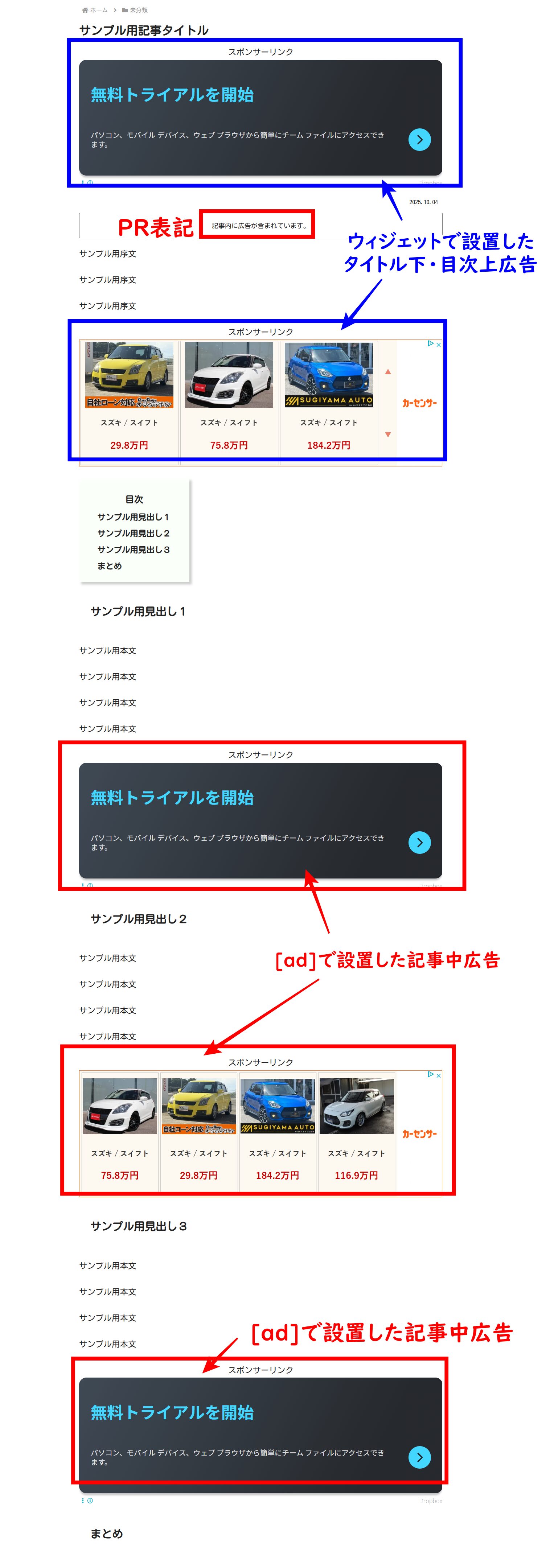 タイトル下・目次上・記事中それぞれの広告の表示を見てみましょう ↓