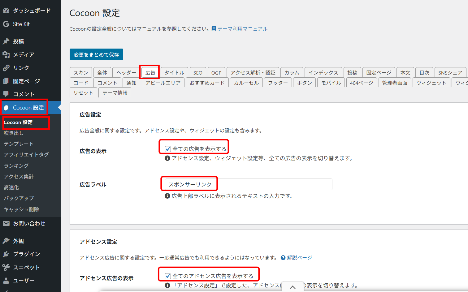 その後、ワードプレスへ行き「Cocoon設定」⇒「Cocoon設定」へと進みます。