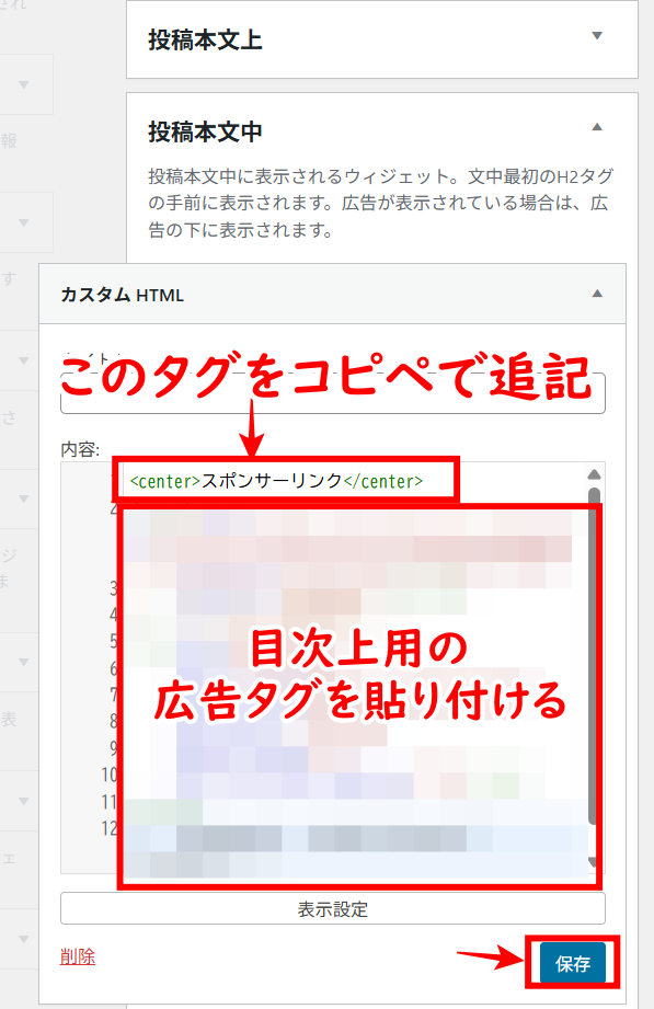 ここまでできたら、あとは「タイトル下・目次上・記事中」への広告設置設定をしていきます