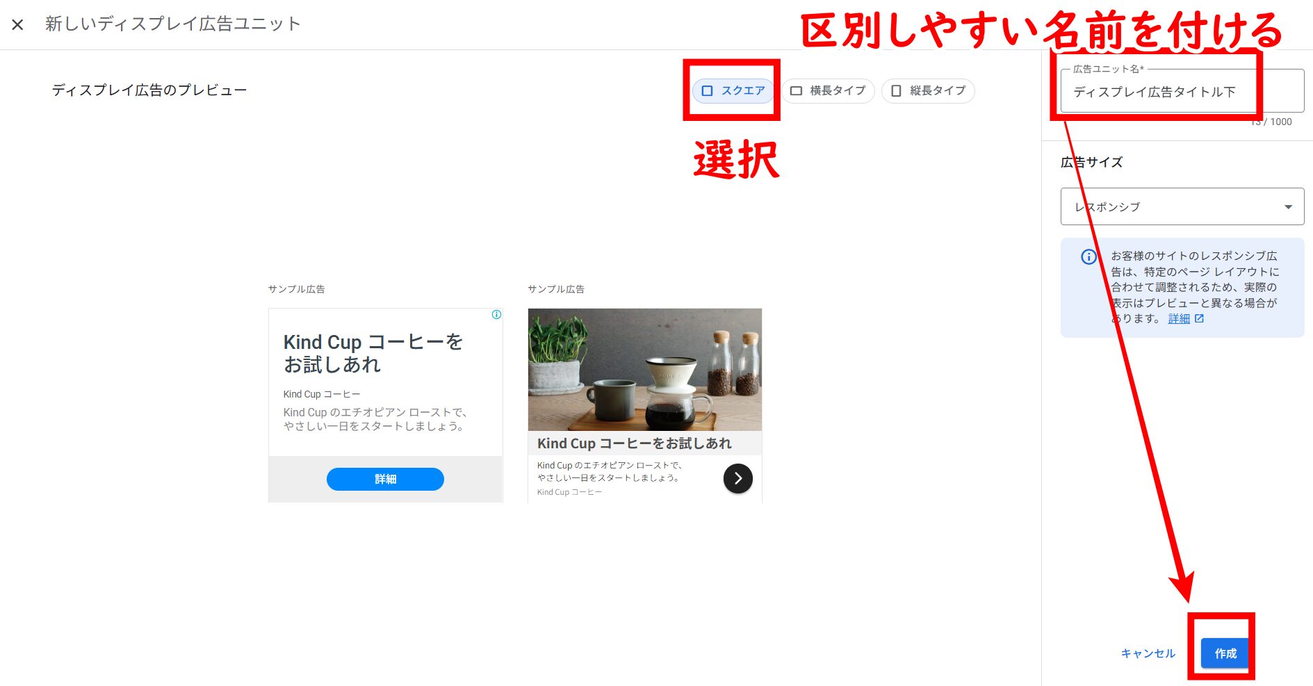 ②「レスポンシブ」のままでOK。これを選択しておくと、スマホやPC、タブレットなどデバイスに応じて自動的に広告サイズが調整されます。