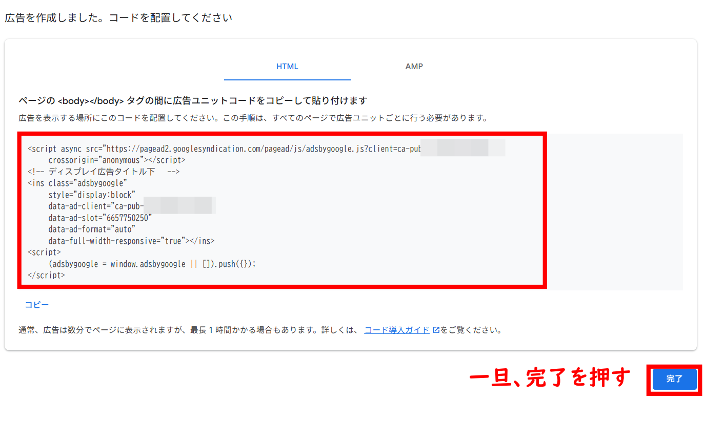 再びアドセンス管理画面へ行き、記事中用の広告タグをコピーしてきましょう。