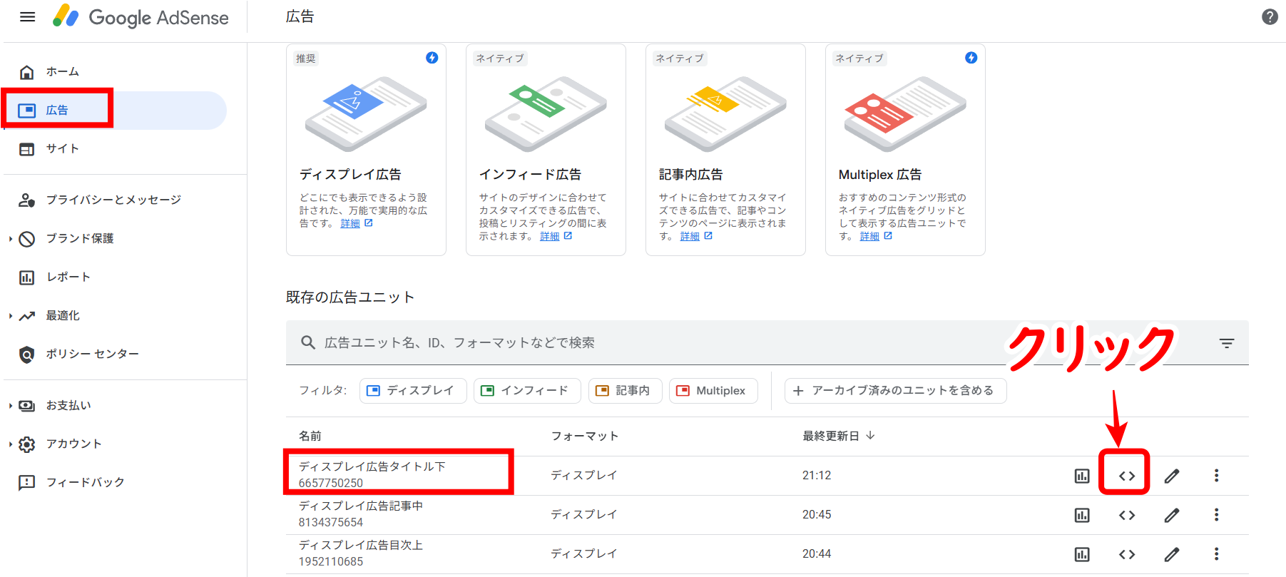 『広告』⇒『広告ユニットごと』⇒『ディスプレイ広告』をクリック。
