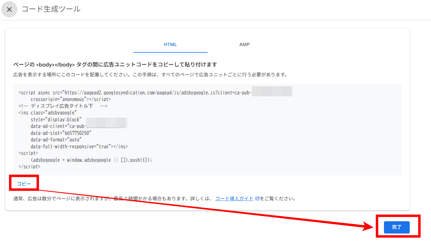 こちらが、実際にWordPressに設置する広告コードになります。