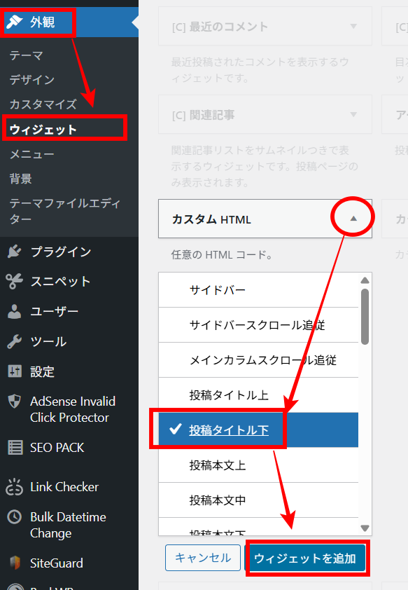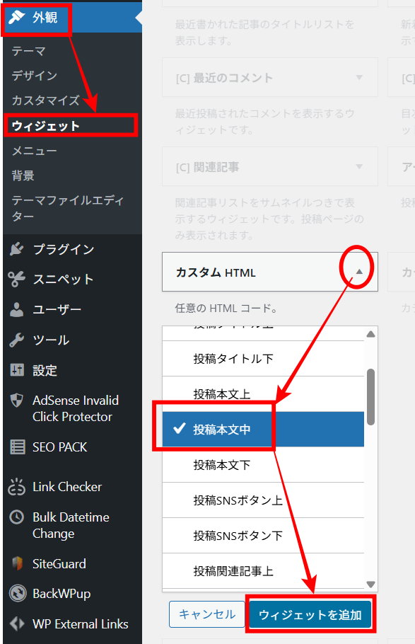 外観⇒ウィジェットに進み以下の通りに広告コードを設置します