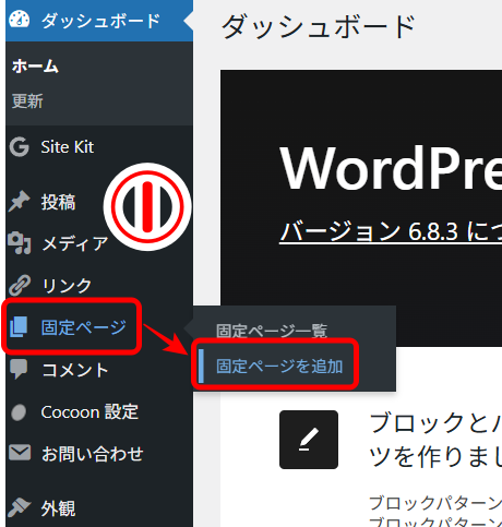 まず、ダッシュボードに入り、【固定ページ⇒固定ページを追加】を開きます