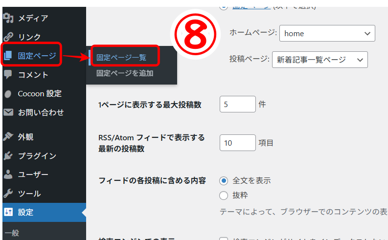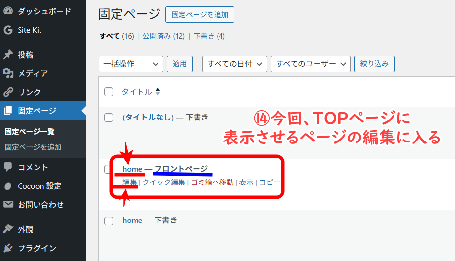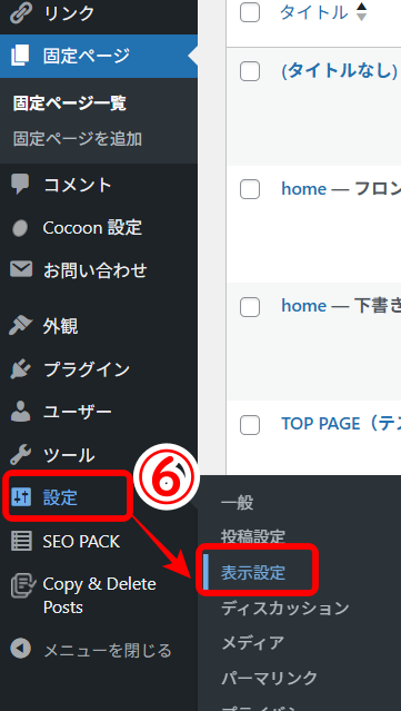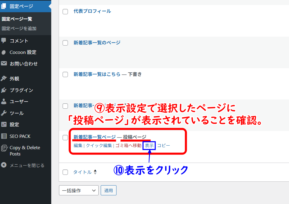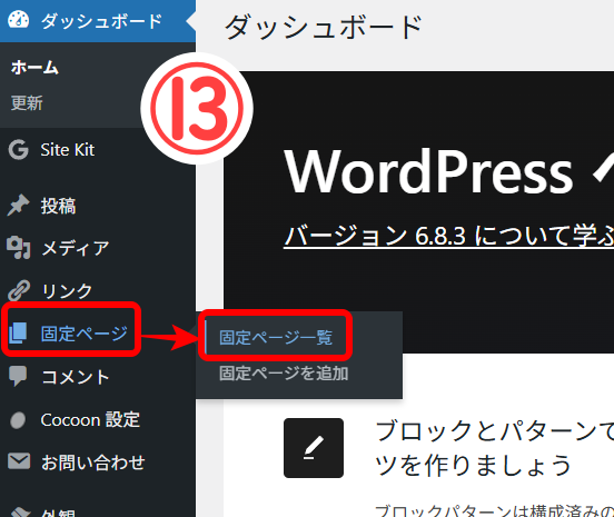 再び【固定ページ⇒固定ページ一覧】を開きます