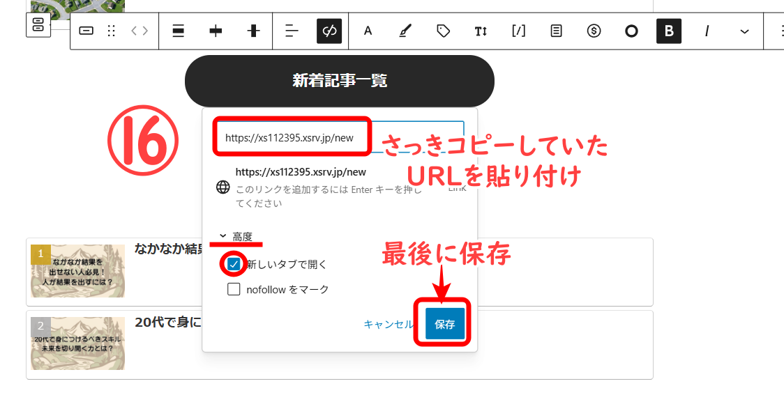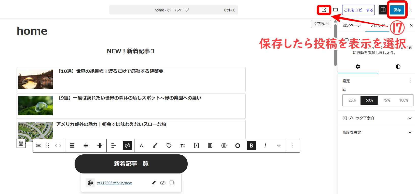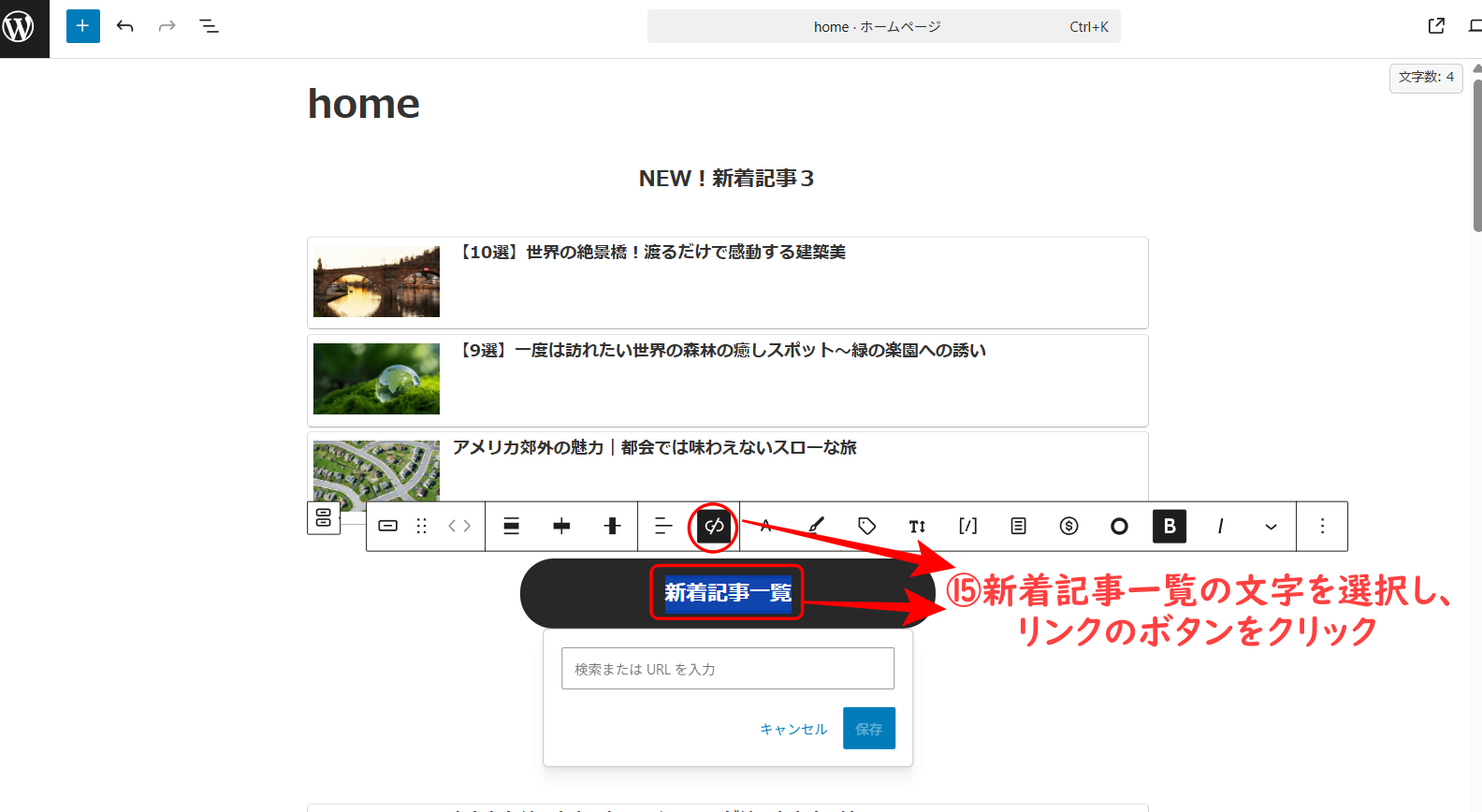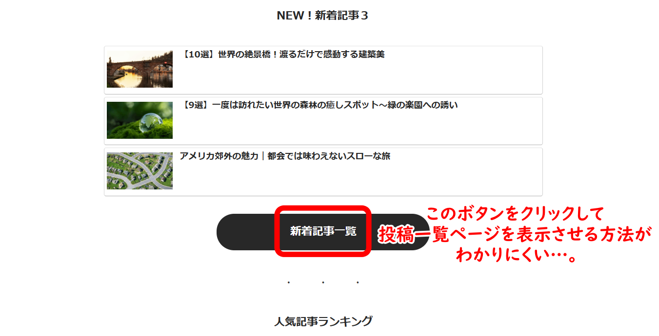 該当箇所:新着記事一覧ボタンに投稿一覧ページをリンクさせる解説個所