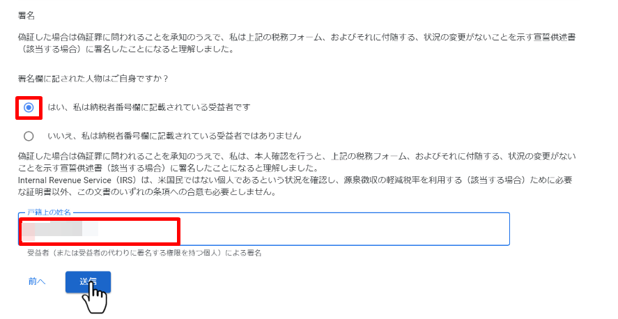 署名欄のボックスにチェックを入れ、戸籍上の姓名を入力します。(例:Kenji Suzuki)